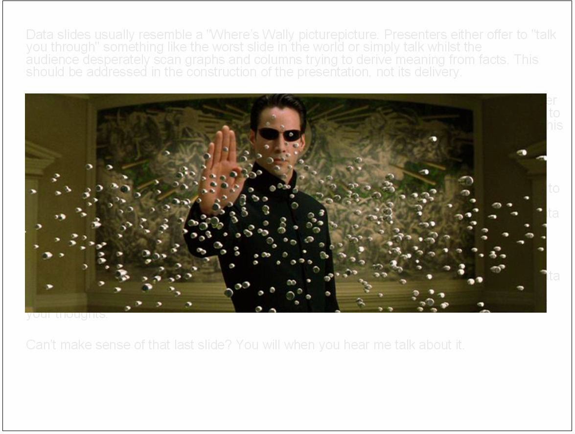 When you have considered what the “So what” of your message is, you should have constructed an arc determining how you will convince your audience to move from where they are at the beginning of your all to where you would like them at the end and this makes up your story. Rather than considering that you will detail every one of those steps using words, support your narrative with illustration. This will allow the audience to understand the current theme you are discussing without being distracted by the text behind you so they can concentrate on what you are saying.