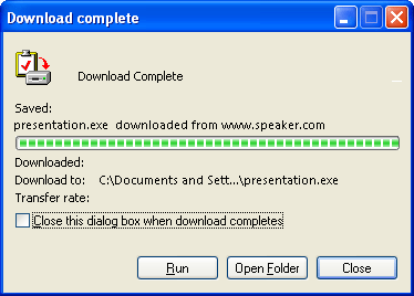 Taking the analogy further however it is often the case that although a large quantity of information may be transferred as in downloading an executable file (presentation.exe) Of the three options noted in the download window for utilising this information it is usually Close that is selected and little value persists. How often have you left a presentation and actually used all of the information delivered, actually Run the programme? Infrequently this is stored but very seldom is Open Folder selected to review this information. How often do you actually make notes and refer to them later? Worse is that the download is frequently incomplete and therefore useless as an .exe file, essential components being lost in the process of transfer due to the attention of the audience being elsewhere during the presentation. Just for balance, Mac users, do you actually drag the download to applications?