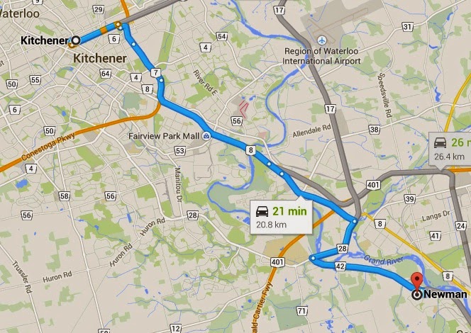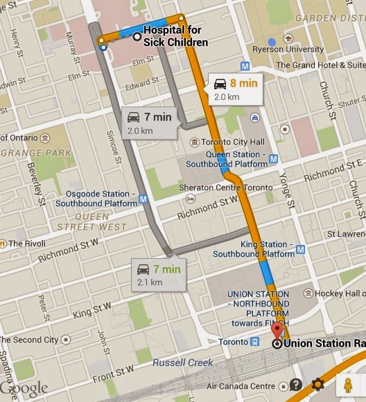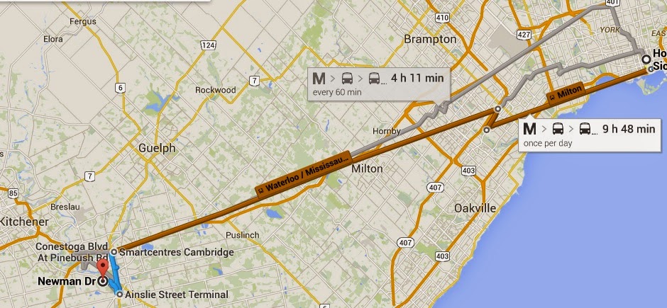 Following my time at Toronto Sick Kids I walked out of the front entrance out onto Elizabeth Street. Turning south, I walked down Elizabeth Street to take a left onto Hagerman Street and the T junction onto Bay Street. I stopped momentarily at the Toronto Old City Hall to admire the clock. Continuing south on Bay I passed Trump Towers, musing on the great man’s haircut, The Toronto Dominion Centre and then turned right onto Front Street. Being early for the train I stopped for a beer in The Loose Moose Grill. I nipped out from the bar and walked back along Front Street to Union Station, descended two flights of stairs and then up another flight of stairs to Platform 5 at which the #207 train was waiting. It left on time and stopped at Bloor, Weston, Etobicoke North, Halton, Bramalea, Brampton, Mount Pleasant, Georgetown, Acton, Guelph and finally arrived at Kitchener. We arrived at Platform No2. We drove from Kitchener to Cambridge on Regional Roads 55, 8, 28 before turning onto 48 and then via Blair and Princes to Newman Road.