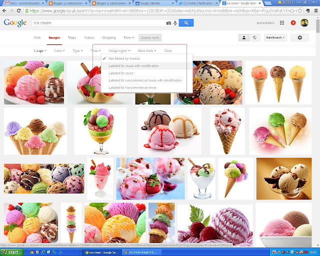 There are 3 very helpful buttons. No1 will take you directly to images of “ice cream” with some (occasionally) helpful collections across the top. Before you get carried away (there’s a lot of lovely ice cream) you need to filter the search using first the Search tools button No2, then the Size option selecting LARGE. Then under Usage Rights (No3) make your choice of appropriate options. THIS is the group from which you should chose your image.