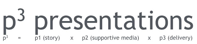 A presentation is made of three component parts; the story (p1), the supportive media (p2) and the delivery of these (p3). The value of a presentation is the product of these three factors, the p cubed value.