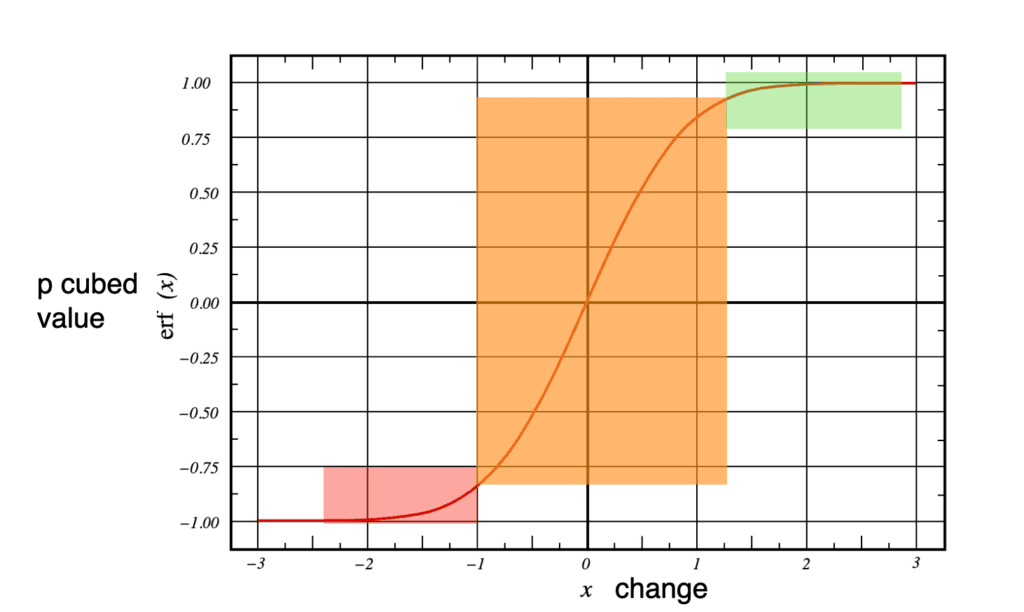 For the vast majority of presentations, the presenter is in the red area. Improvement comes by reducing the number of lines of bulletpoints, using proper images rather than clip art or AI and maybe only 3 images on a slide instead of 6. These are improvements but the increased value for the audience is minimal. In the orange area there is a dramatic and consistent increase in the p cubed value as improvement over improvement is made. These are the presenters who have planned their presentation, considered the needs of the audience and constructed a simple, single, memorable message. These are the presentations in which the weight that the p2 is trying to carry has been dramatically reduced, where there is clarity and consistency in the media and where the presenter is making use of blank slides to focus the audience. These are presenters who engage the audience, interact and inspire. Lastly, the green zone where significant effort is required by the presenter to improve as they already are an excellent presenter. The nuances of improvement noticed by the audience have taken time and research and planning that few will see or understand.
